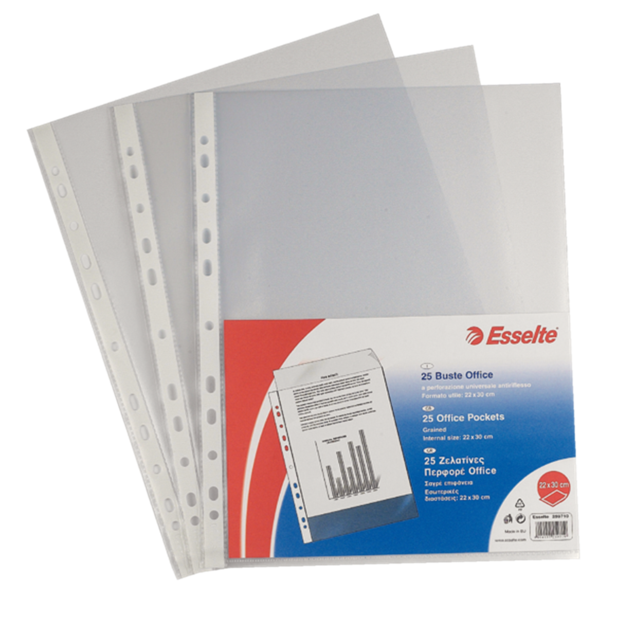 Kvalitetsficka för dagligt bruk. Praktisk förvaring av stora A3-dokument i gaffelpärmar och ringpärmar. Öppning upptill för enkel borttagning av papper utan att frigöra pärmmekanism. Klar präglad ficka i PP. 85 my. Universalhålad.