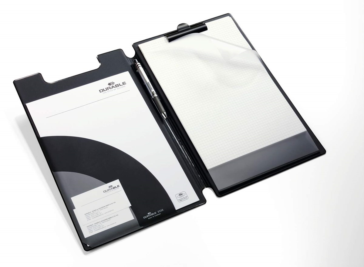 Stadigt blockomslag för A4+ format av plastöverdragen kartong Halvcirkelformade fickor på insidan för lösa papper och visitkort Kraftig metallklämma som håller blocket på plats Mellanlägg för skydd av bladen under det som det skrivs på Inbyggd hållare för en penna