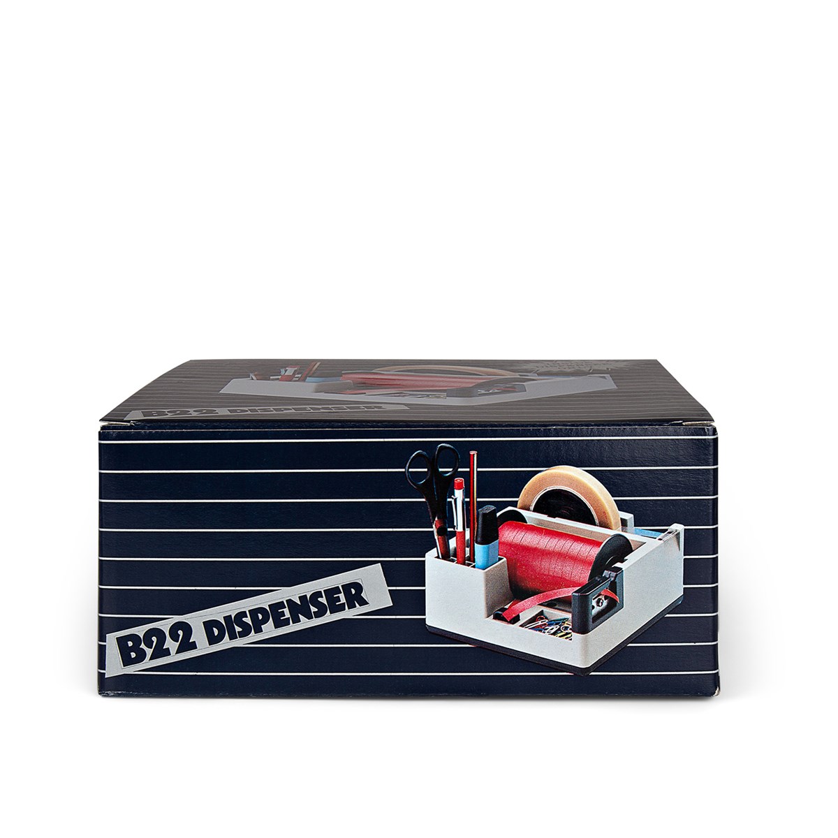 Kombinerad hållare för både tejp och presentband eller snöre samt med praktiska fack för sax, pennor och gem. Idealisk för presentinslagning då man har allt som behövs till hands. Hålls på plats på bordsytan genom sin tyngd och gummerade undersida vilket gör att tejp och presentband lätt kan rivas av med en hand. Ett tandat metallblad skär av tejpen till önskad längd.