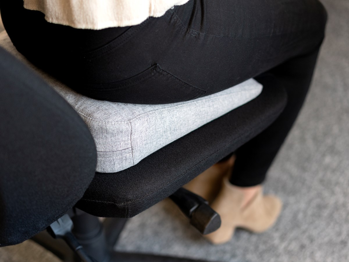 Förbättrar balansen, avlastar ryggen och ger en bättre sitthållning. Aktiverar och stärker bål- och sätesmuskler. Perfekt att använda på kontorsstolen. Mått: 32 x 32 x 7,5 cm. Filttyg.