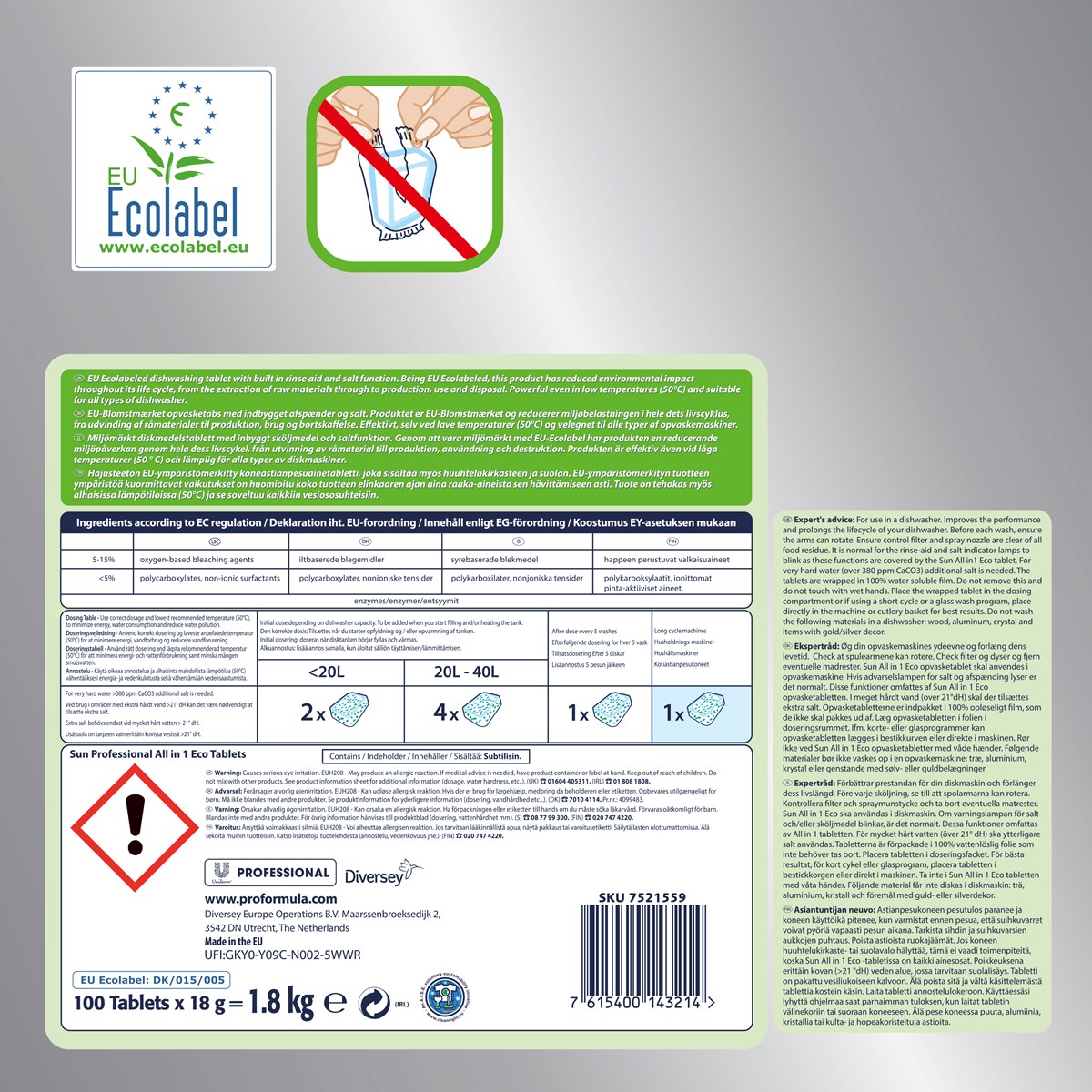 Diskmaskinstabletter med integrerad sköljmedels- och saltfunktion. Denna produkt har miljömärket EU Ecolabel och uppfyller höga miljöstandarder under hela livscykeln: från utvinning av råmaterial till produktion, distribution och avfallshantering. Kraftfull rengöringseffekt även vid låga temperaturer (50°C) Lämplig för både hushållsdiskmaskiner och professionella diskmaskiner med 1-5 min-cykel (se bruksanvisningen).