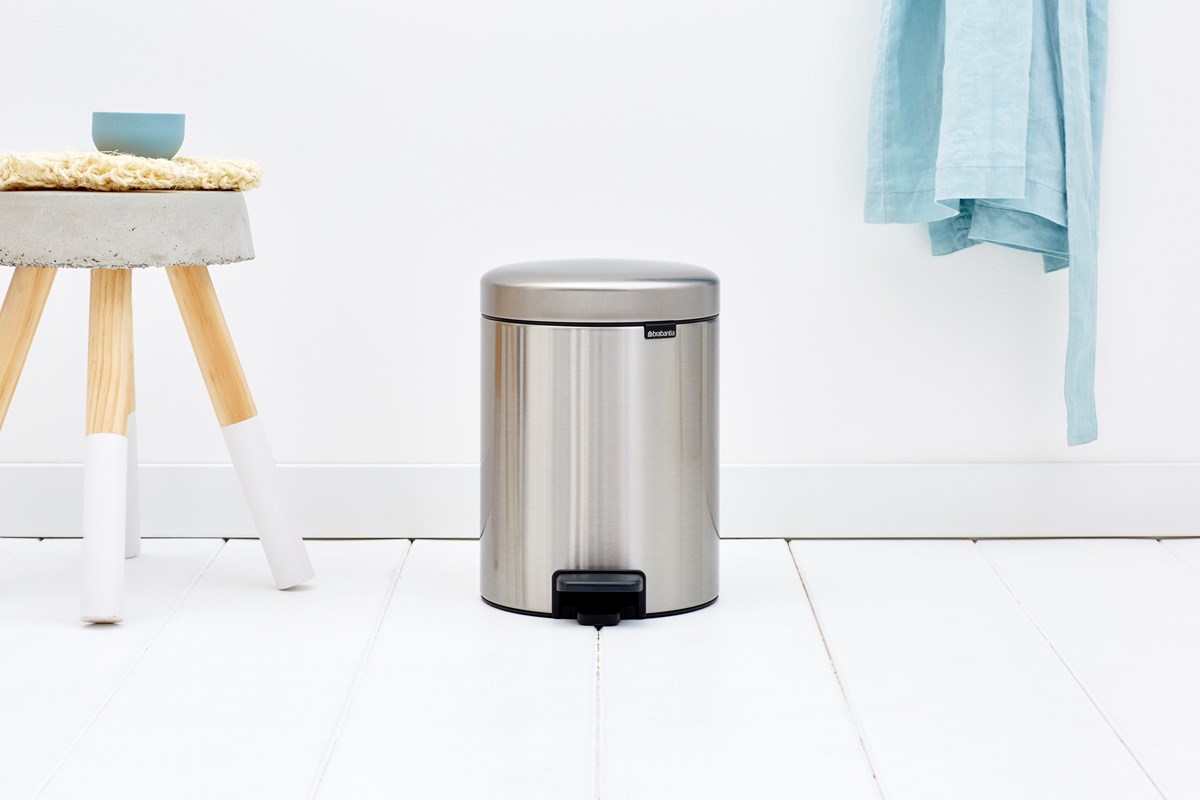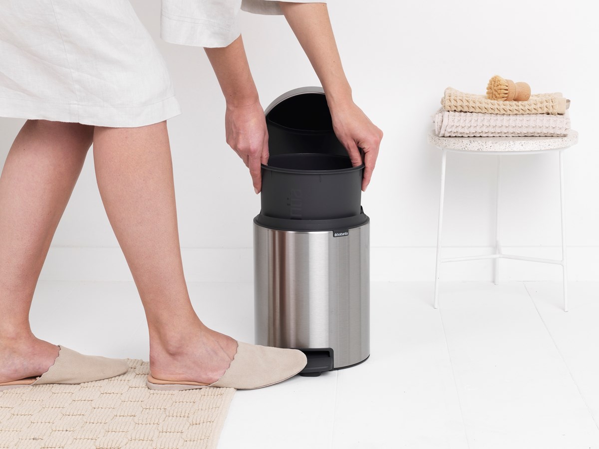 Klassisk pedalhink med block i botten som förhindrar att den tippar. Lock med mjukstängning. Innerhink av plast som är enkel att rengöra. Tillverkade av 40% återvunnet material och efter användning är 98 % av behållaren återvinningsbar. 10 års garanti. Mått: 291 x 205 x 205 mm.