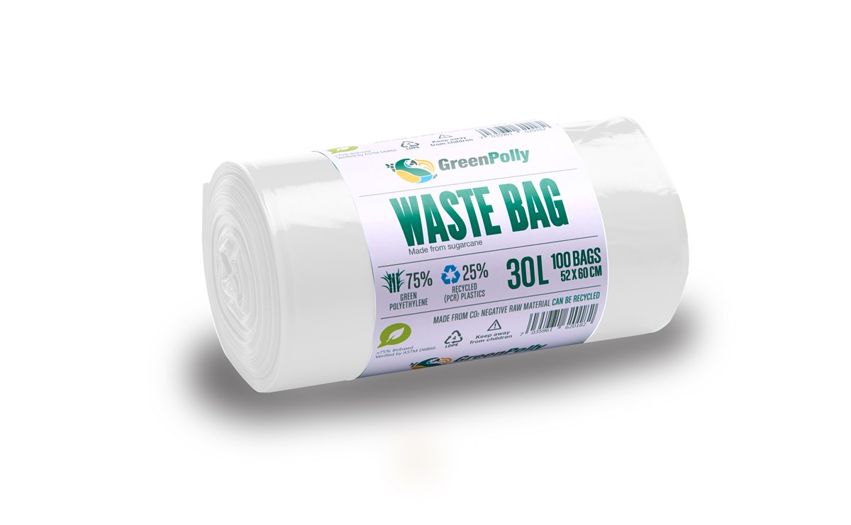 Säckar i grön polyeten som är tillverkade av mer än 75% förnybara råvaror och 25% återvunnen plast. Tillverkas av förnybara råvaror som sockerrör istället för fossila råvaror. Samma egenskaper som traditionell polyeten. Kan återvinnas.