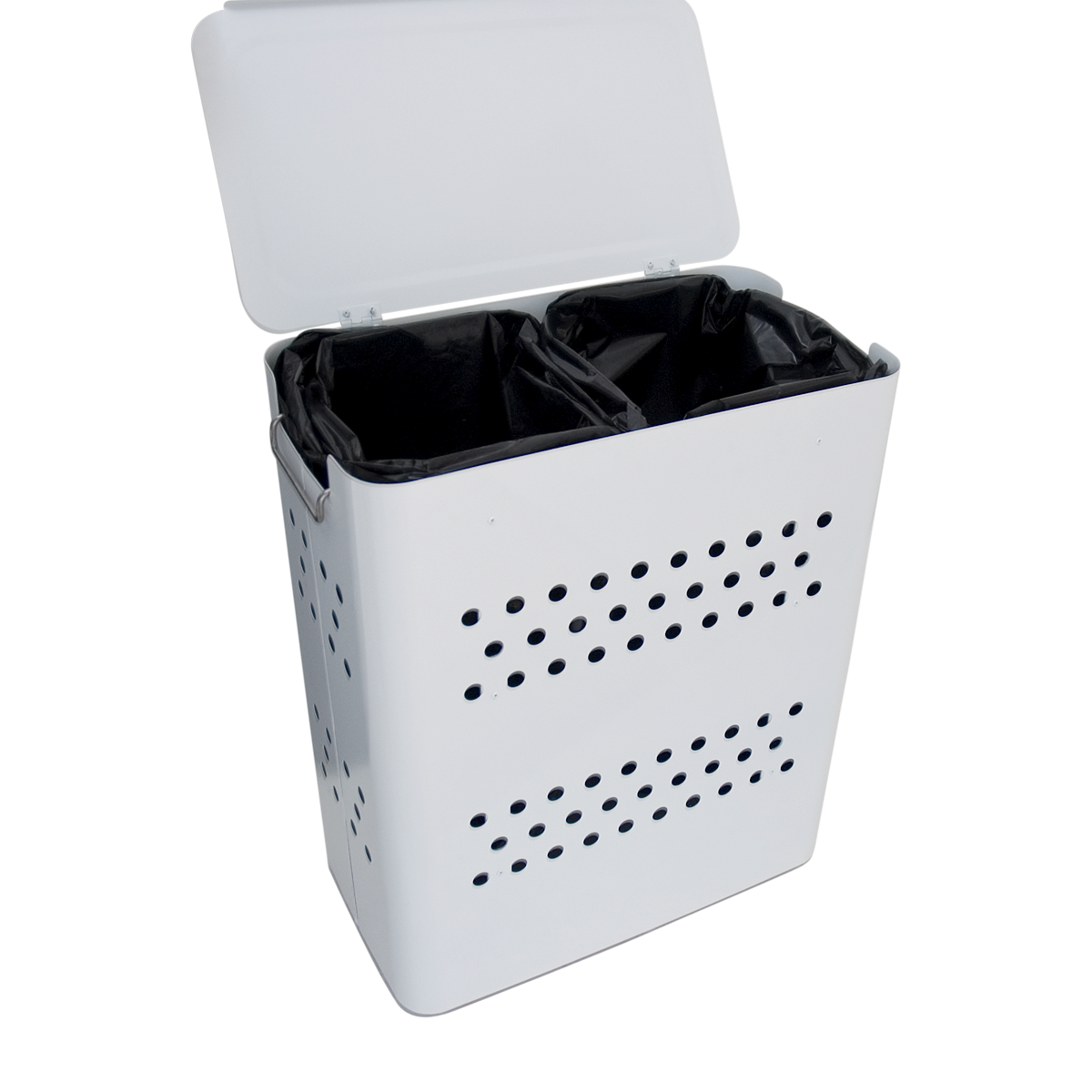 Avfallstunnan Patrik i grått med säckhållare för 2 st 60 L avfallssäckar, eller 1 st 125 L säck. Tunnan rullar på hjul för den enkelt skall kunna flyttas vid städning. Dessutom finns nyckelhålsfästen på sidan för att kunna montera den på vägg. Locket sitter fast med gångjärn.