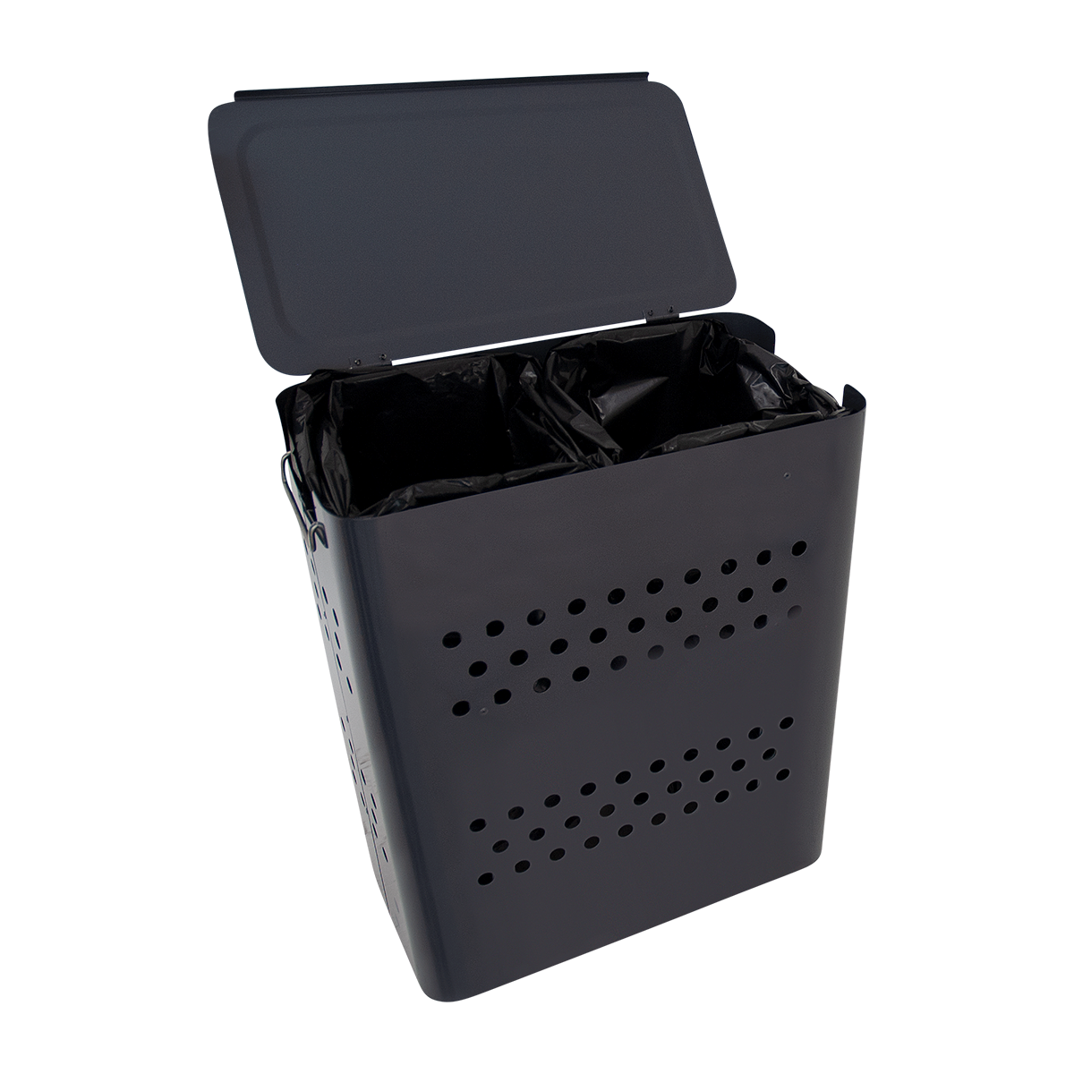 Avfallstunnan Patrik i grått med säckhållare för 2 st 60 L avfallssäckar, eller 1 st 125 L säck. Tunnan rullar på hjul för den enkelt skall kunna flyttas vid städning. Dessutom finns nyckelhålsfästen på sidan för att kunna montera den på vägg. Locket sitter fast med gångjärn.