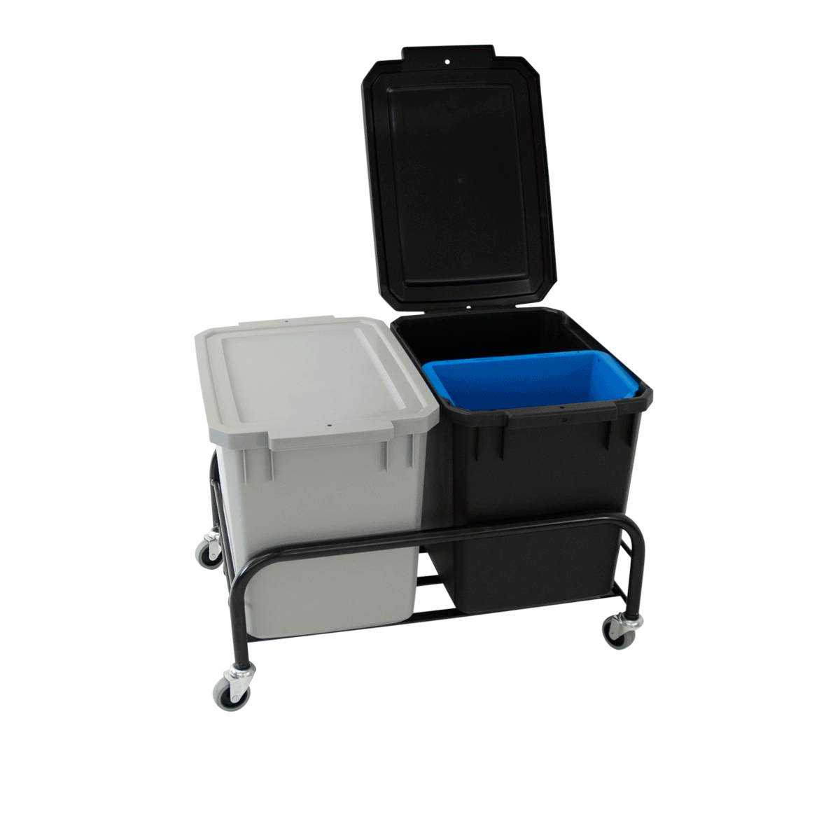 Sorteringsvagnen för två stycken 25 L kärl. Vagnen har fyra stycken lättrullade gummihjul.