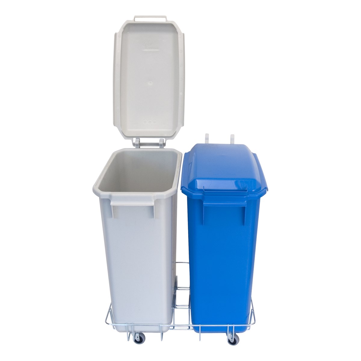 Vagn till 2x60 L kärl i zinkad metall. Vagnen är staplingsbar med rejäla hjulfästen.