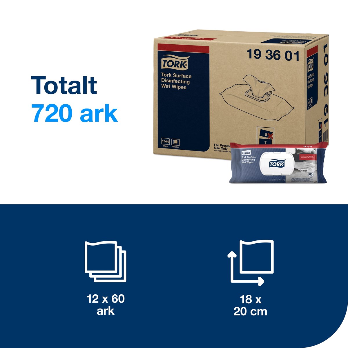 Ett desinfektionsmedel som är redo att användas och effektivt mot ett brett spektrum av bakterier och virus, inklusive coronavirus. Det är dermatologiskt testat och fritt från etanol. Lämpliga för användning på hårda, icke porösa ytor och föremål. De levereras i flow pack om 60 dukar med återförslutningsbart lock för att våtdukarna inte ska torka ut.