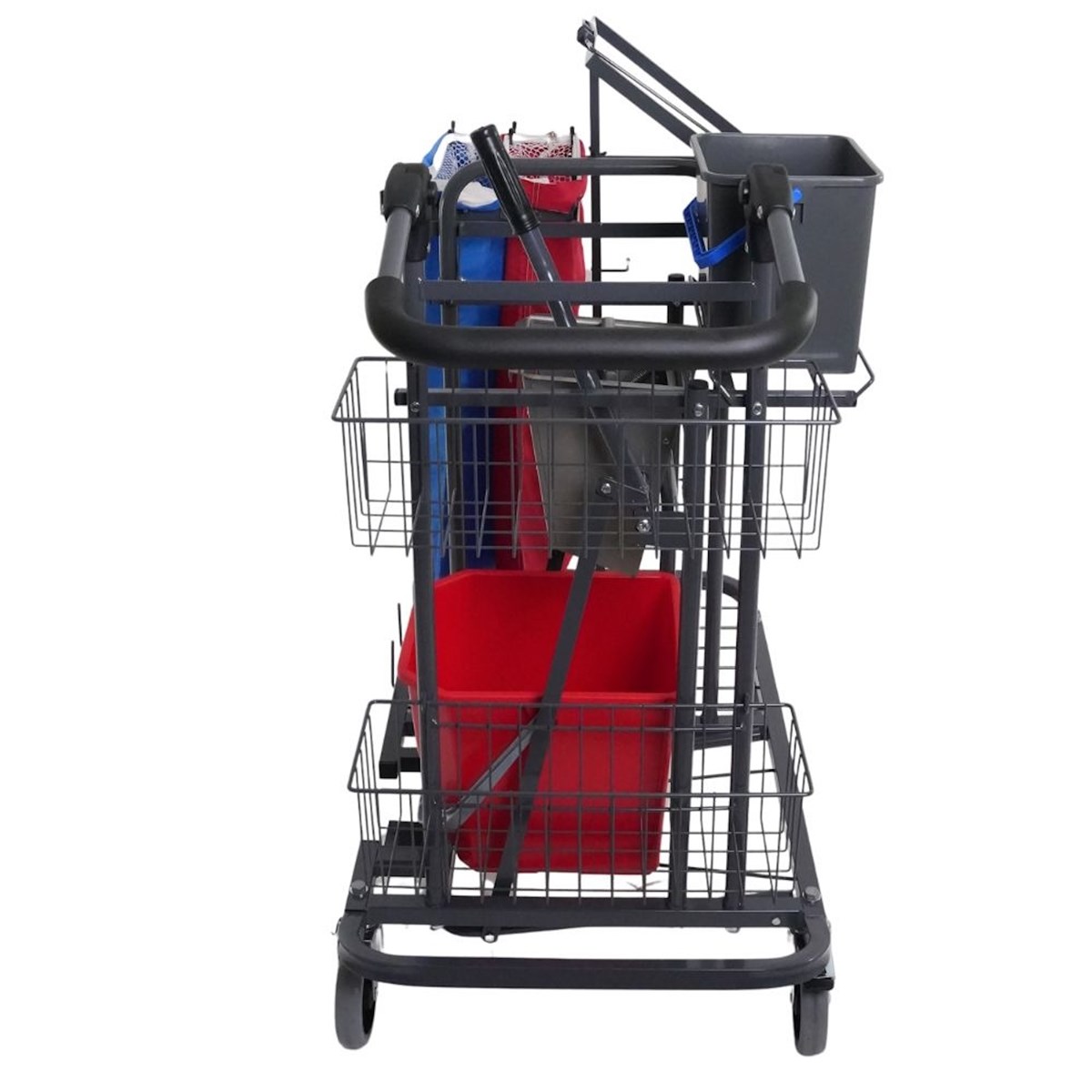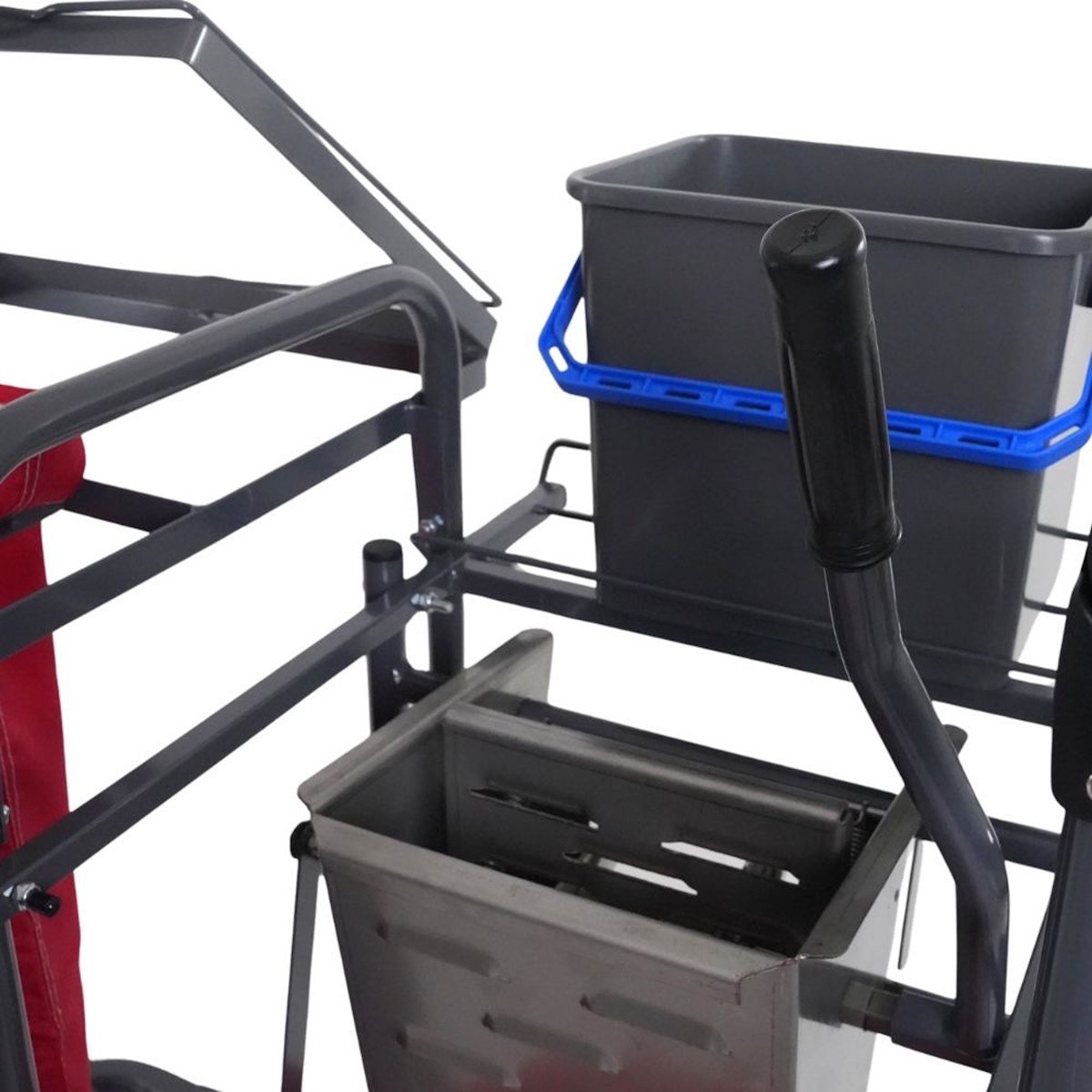 Vagnen är av hög kvalitet, robust och ergonomiskt utformad för moderna städmetoder. Komplett med 3 st korgar, tröskelkrypare, rostfri press, 15 l hink, 6 l hink, sopsetshållare, 2 st tvättsäckar och 2 st tvättnät. Mått: L 930 mm, B 580 mm, H 1090 mm. Vagnen bygger på flexibla lösningar som tillsammans ska underlätta det dagliga arbetet. Bland annat har vi utrustat vagnarna med ett greppvänligt, varmt och mjukt handtag som ger stora möjligheter till varierad körställning. Ställbart handtag i två lägen. Pressvagnen är utrustad med en stadig rostfri press i bekväm arbetshöjd, hand- och/eller fotmanövrerad. Övrig utrustning är rymliga korgar, sopsäckshållare, skafthållare och tröskelkrypare. S2-Pressvagn har en tröskelkrypare som är ergonomisk och lätt att använda. Med dom lättkörda tysta hjulen så styr Du vagnen ergonomiskt och lätt i ditt dagliga arbete