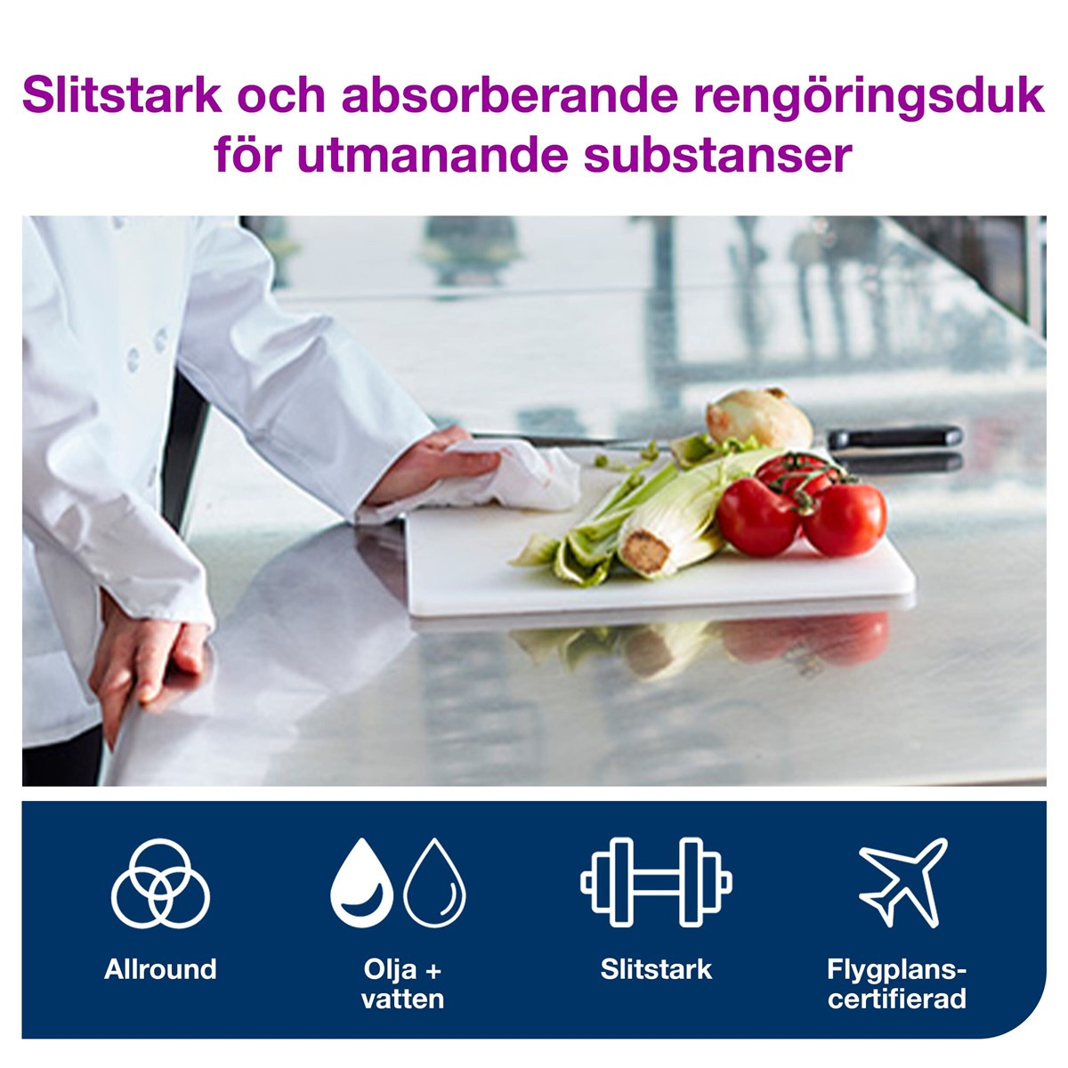 Mycket tålig och absorberande non-woven-duk som kan användas med de flesta lösningsmedel. Tar snabbt bort olja, fett, vatten och envisa fläckar. Utformad för att skydda dina händer från hetta och metallspån. Med exelCLEAN som ger resultat i toppklass. Mått: 38,5 x 32 cm. 45 vita dukar/förp. 360 dukar/kartong.