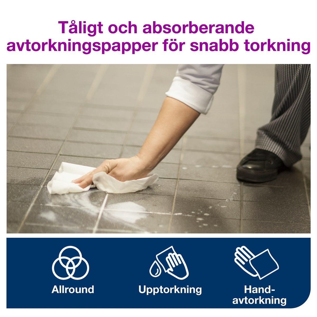 Allroundpapper som är perfekt för spill och handavtorkning 2-lagerspapper som är slitstarkt och absorberande Obegränsad utmatningsfunktion – ta så mycket som behövs Enkel att använda med en hand Tork slutindikator gör att du kan planera byten av rullar i förväg