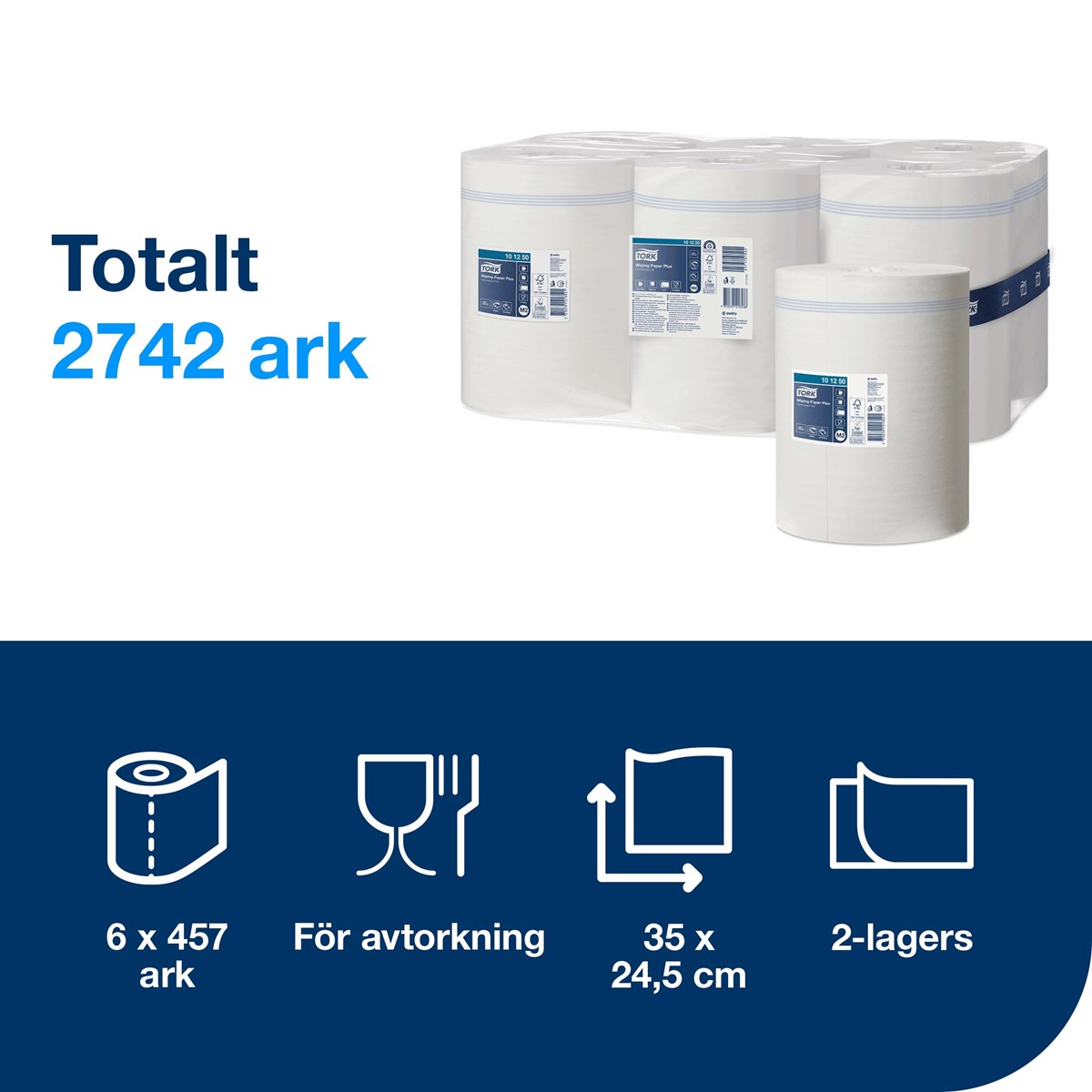 Spill hör till vanligheterna i kök med högt tempo och i industrilokaler där det kan vara tidsödande att städa upp. Använd vårt tåliga och absorberande Tork Avtorkningspapper Plus för att snabbt torka upp vätskor och torka av händerna. Rullens centrummatade dispenser har en hög kapacitet och obegränsad utmatning för att personal ska kunna ta så mycket industriellt papper som de behöver. Tork slutindikator möjliggör för personalen att planera byten av rullar, vilket motverkar avbrott i arbetet.6 rullar, med 457 dukar vardera. 2-lagers. Advanced-kvalitet. Storlek på rulle: D 160 m, B 24.5 cm. Arkets längd: 35 cm. Passar med M2 dispensrar.