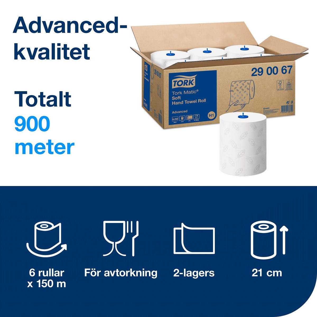 Gör det bekvämt för dina besökare med Tork Matic® Handduk på rulle i Advanced-kvalitet. Pappret ger ordentlig torkning och har en snygg mönsterprägling av gråa löv. Rullarna passar i Tork Matic® Dispenser handduk på rulle som har utvecklats för enkelt underhåll i välbesökta toalettutrymmen. Dispensern sparar tid och reglerar åtgången genom att mata ut ett ark i taget. 150 m/rulle. 21 cm bred. 1,3 kg.