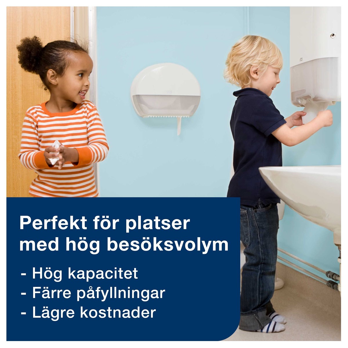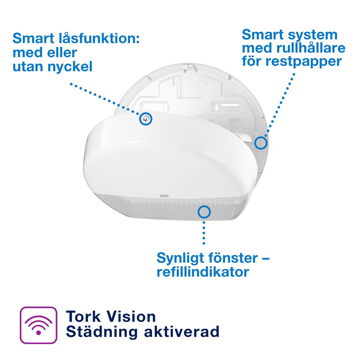 För välbesökta toalettutrymmen Sluten dispenser som skyddar rullarna och förbättrar hygienen Hög kapacitet för färre påfyllningar Optimal rullbroms minskar förbrukningen Smart rullhållare för restpapper som ger mindre avfall
