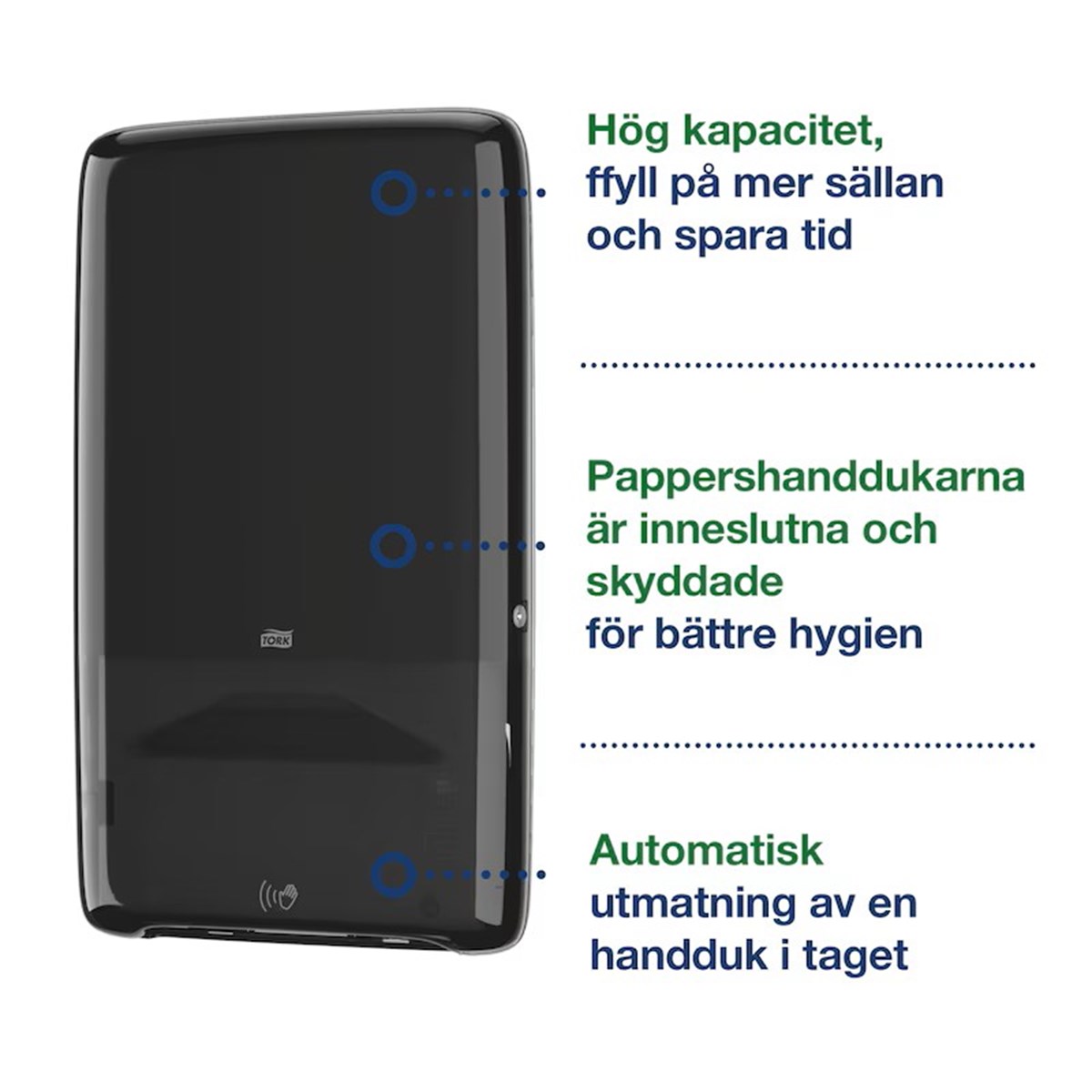 Hållbar strömlösning som alternativ till batterianvändning Utmatning av ett ark i taget minskar förbrukningen och ger förbättrad hygien Enkel rengöring och intuitiv påfyllningsmekanism sparar tid Rullar kan enkelt fyllas på för att undvika att pappret tar slut
